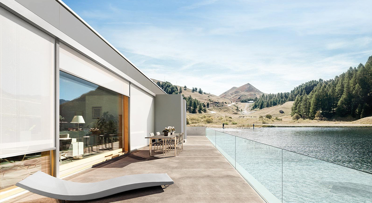 太陽能驅(qū)動底軌隱 藏式抗風(fēng)拉鏈卷簾 罩盒: 110mm×150mm 最大寬度: 4000mm 最大高度: 3000mm