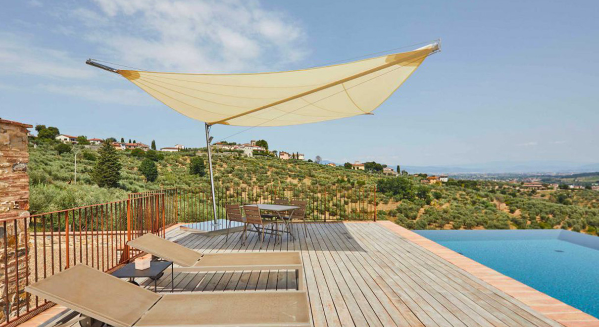 戶外獨立式飛翼簾 單幅最大尺寸: 7000x7000mm Kheope 13 單幅最大尺寸: 9200x9200mm 需四個支撐點
